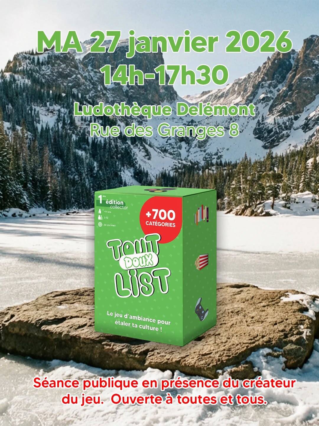 Animation le mardi 27 janvier de 14h à 17h30 à la Ludothèque de Delémont