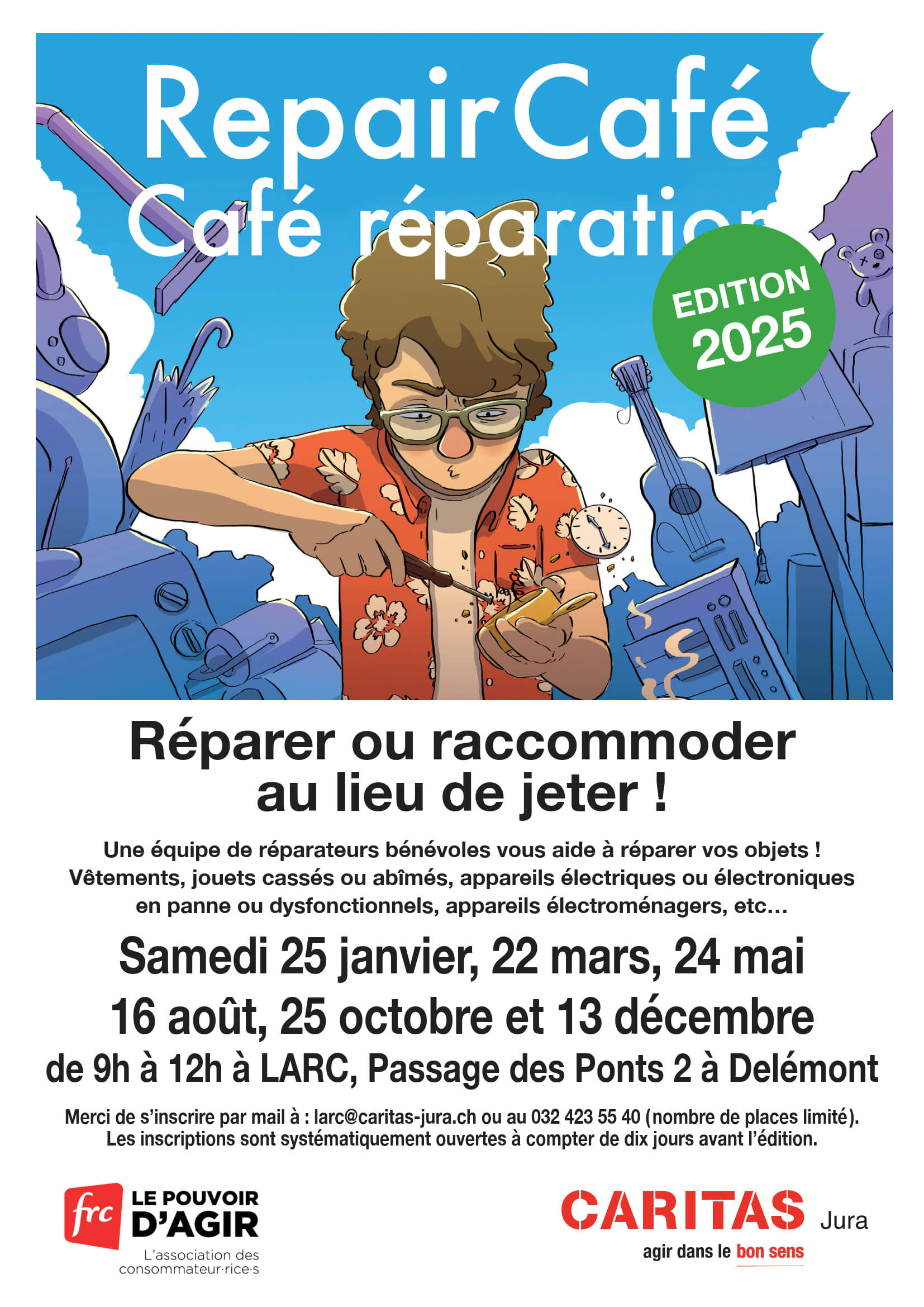 Nous demandons aux personnes désirant faire réparer un objet ou un textile de s’inscrire à l’adresse e-mail suivante : larc@caritas-jura.ch ou par message WhatsApp au 079 429 92 65. Les inscriptions seront prises respectivement dès le 16 octobre 2025. Les personnes inscrites pourront amener leur objet en réparation selon un horaire défini à l’avance. Elles assisteront à la réparation. Le REPAIR CAFE est une solution efficace contre le gaspillage des ressources et l’obsolescence programmée.
