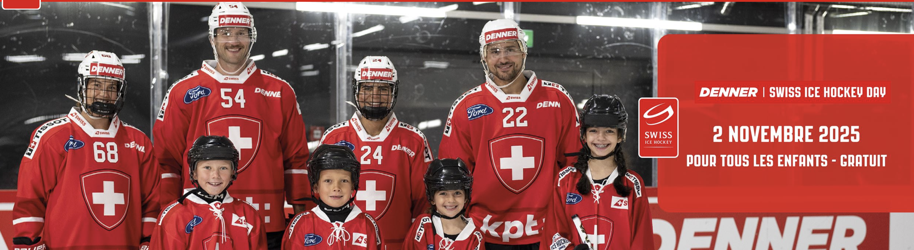 Le hockey sur glace est un sport d’équipe. Notre devise : S’entraîner ensemble, se battre ensemble, gagner ensemble ! Nous souhaitons entretenir cette symbiose lors du Denner Swiss Ice Hockey Day 2025. Participe toi aussi et emmène une ou un ami. Ensemble, vous pourrez effectuer des exercices sur la glace et vous entraîner avec des stars de National League, Swiss League et Women’s League. Voici comment participer : En sus de vos patins, vous aurez besoin d'un casque personnel (idéalement un casque de hockey sur glace muni d’une grille ou encore un casque de vélo) et des gants. Cet équipement est obligatoire pour la participation. Il est en outre recommandé de porter des coudières et des genouillères. Le Denner Swiss Ice Hockey Day est gratuit et aura lieu le 2 novembre 2025. De plus, un joli cadeau attend les participantes et les participants.