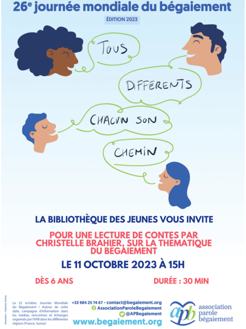 Le 22 octobre aura lieu la 26ème journée mondiale du bégaiement. En collaboration avec l'Association Parole Bégaiement, la Bibliothèque prend un peu d’avance et vous invite à venir partager un moment ensemble autour de contes sur le bégaiement, lus par Christelle Brahier !