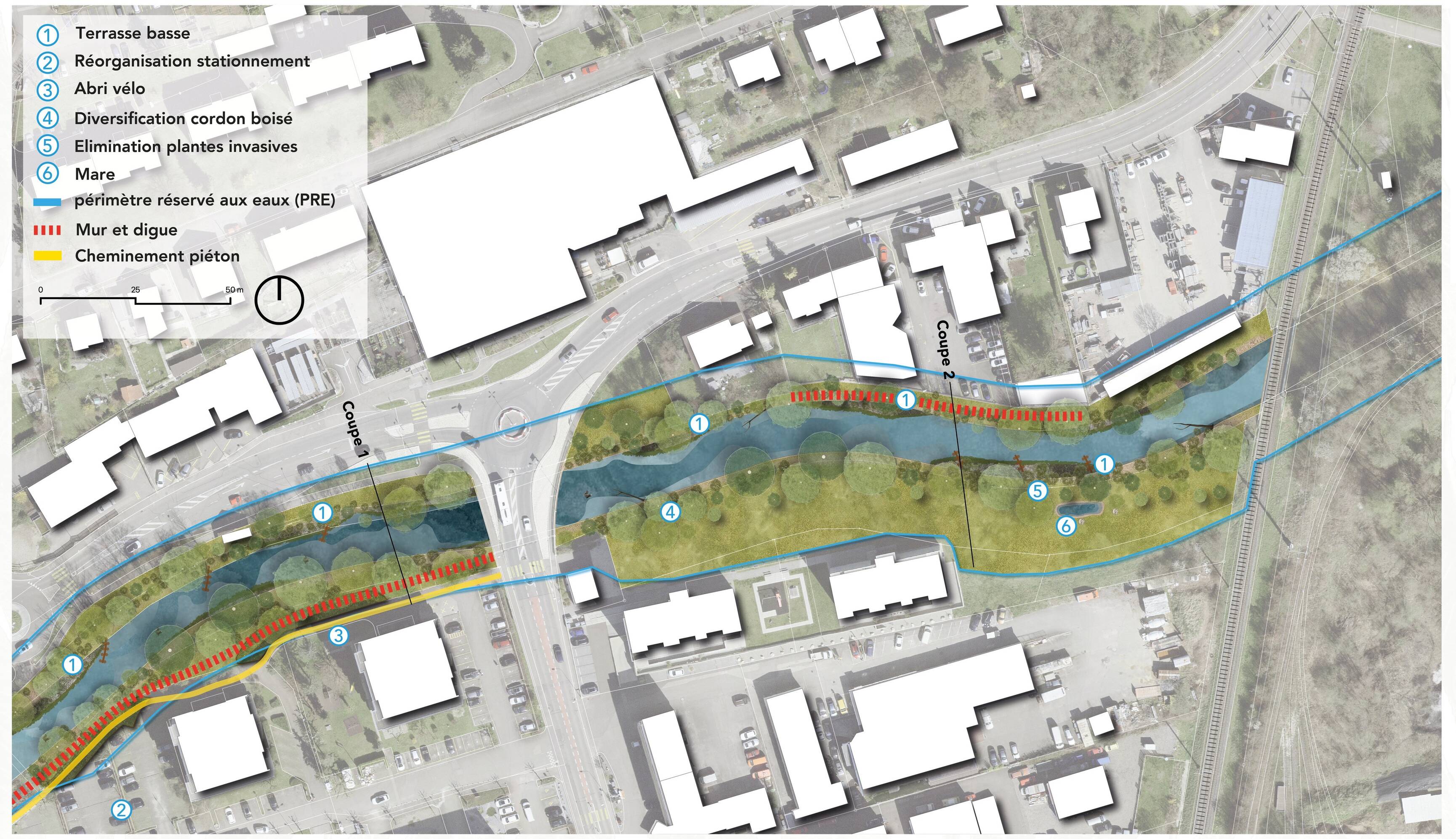 Les aménagements prévoient de renforcer les habitats du lit avec la pose de souches, d’épis à bois mort et de blocs épars ainsi que de végétaliser les parties inférieures des rives avec du bois morts, des herbacées vivaces et pionnières et une arborisation à bois tendre. Une mare peu profonde et favorable aux espèces de batraciens, ainsi qu’aux libellules, canards, couleuvres à collier, sera aménagée sur la rive droite en aval du Pont Gygax. Des tas de pierres seront également installés pour offrir un refuge aux reptiles et un abri aux hérissons et à la petite faune.